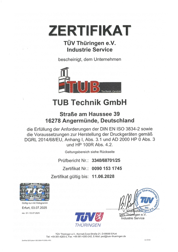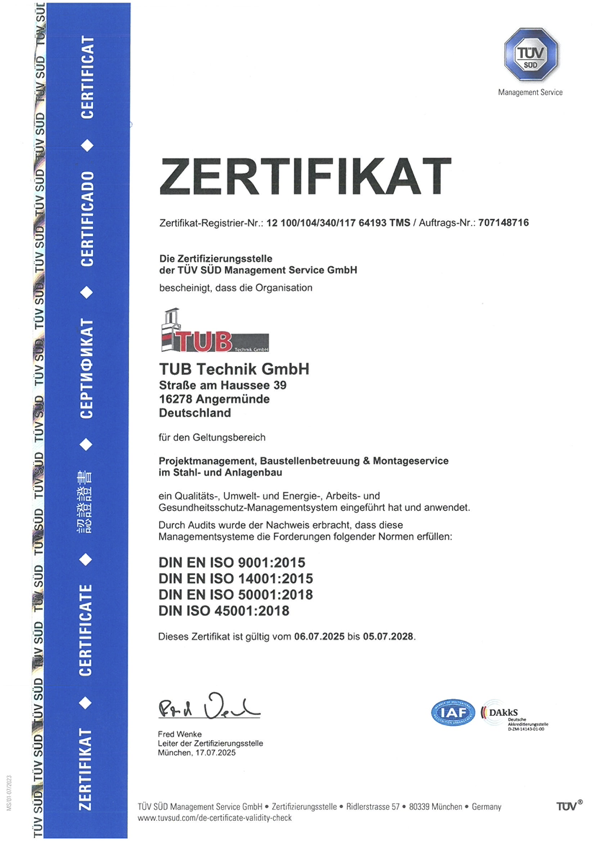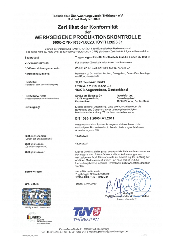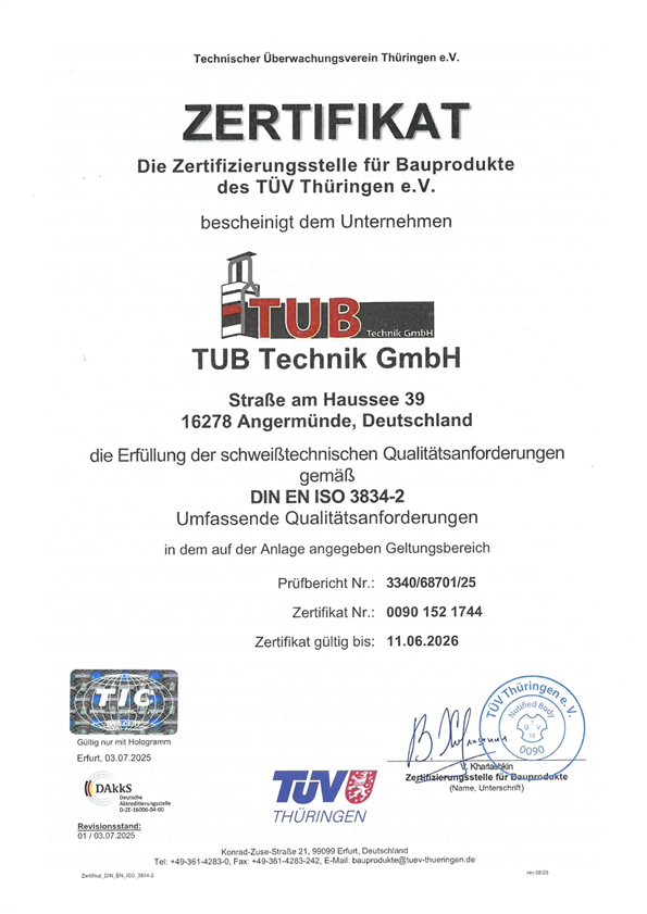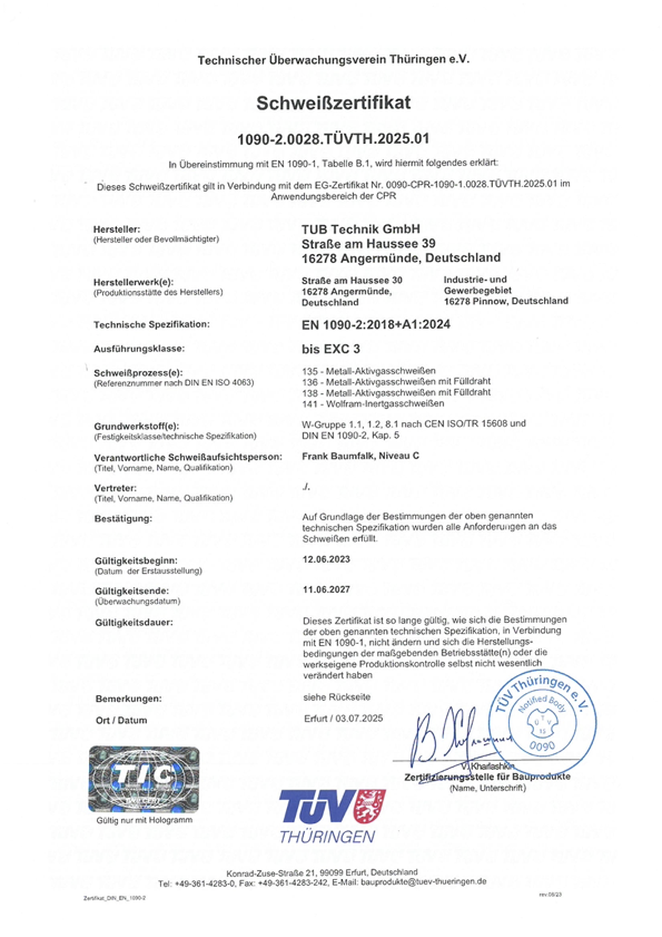 Zertifikate DIN EN ISO 9001 Zertifikat HERUNTERLADEN DOWNLOAD ENG DIN EN ISO 14001 Zertifikat HERUNTERLADEN DOWNLOAD ENG DIN EN ISO 50001 Zertifikat HERUNTERLADEN DOWNLOAD ENG DIN ISO 45001 Zertifikat HERUNTERLADEN DOWNLOAD ENG EN 1090-2:2018+A1:2024 bis EXC 3 Schweißertifikat HERUNTERLADEN DOWNLOAD ENG EN 1090-1:2009+A1:2011 Zertifikat Tragende geschweißte Stahlbauteile bis EXC 3 nach EN 1090-2 HERUNTERLADEN DOWNLOAD ENG DIN EN ISO 3834-2 Schweißzertifikat Umfassende Qualitätsanforderungen HERUNTERLADEN DOWNLOAD ENG DIN EN ISO 3834-2 Schweißzertifikat Voraussetzungen zur Herstellung der Druckgeräte gemäß DGRL 2014/68/EU HERUNTERLADEN DOWNLOAD ENG KombizertifikatDIN EN ISO 9001:2015DIN EN ISO 14001:2015DIN EN ISO 50001:2018DIN ISO 45001:2018 HERUNTERLADEN DOWNLOAD ENG